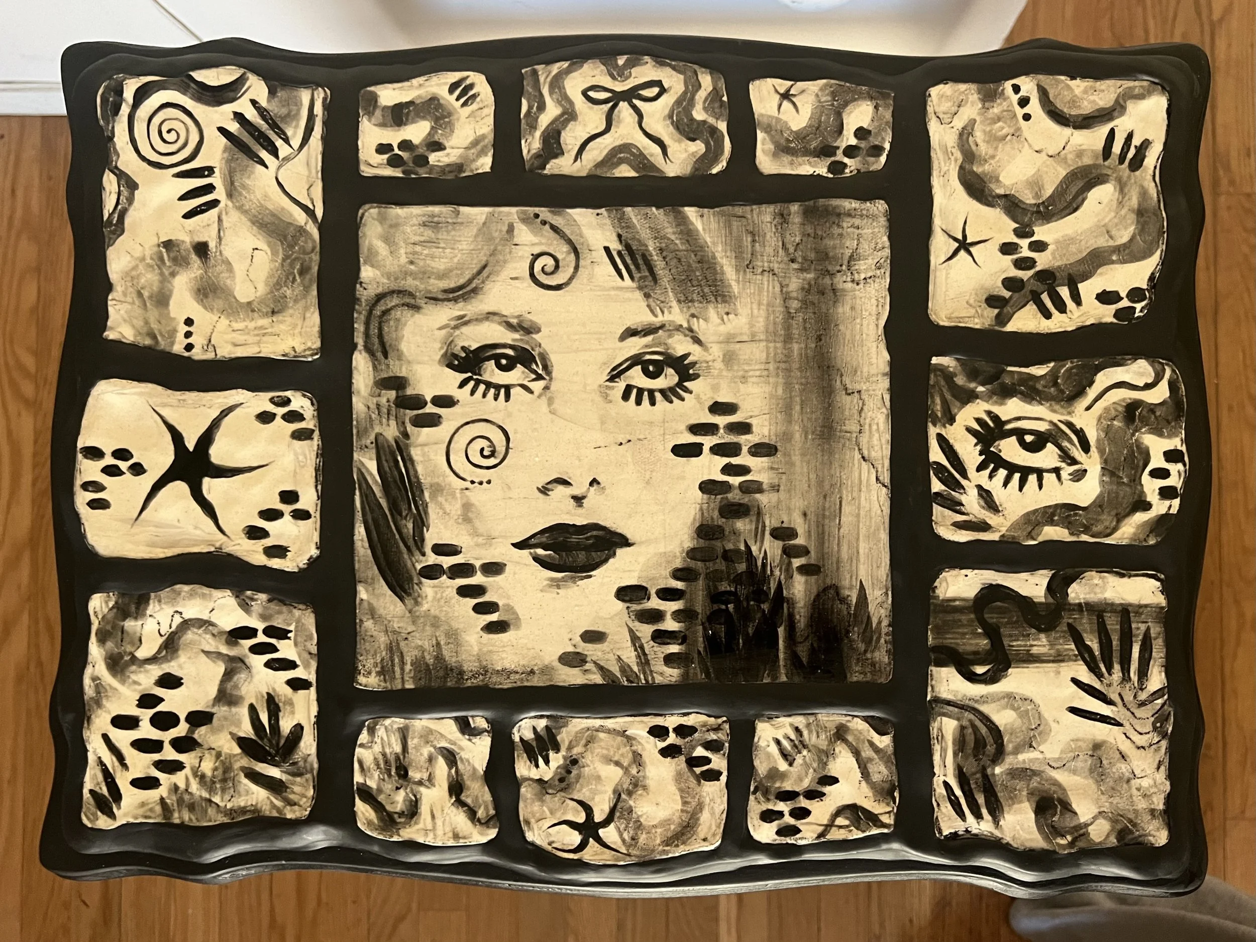 Using handbuilt ceramic tiles and a refurbished rocking chair, Modern Girl Rocking Chair explores motifs of the 1920s the “new woman” or modern girl, confident and poised, with her bobbed hair, fashionable attire, and defiant gaze. She exudes the spirit of liberation and empowerment following the ratification of the 19th Amendment giving women the right to vote. The tiles of the chair combine representational portraits of the modern girl, with her bold makeup and swirled hair, with more whimsical and expressive patterns adding a bit of edge. The black and white color scheme adds to the piece’s emphasis on the 1920s modern girl, encapsulating a vintage feel reminiscent of film stills.
